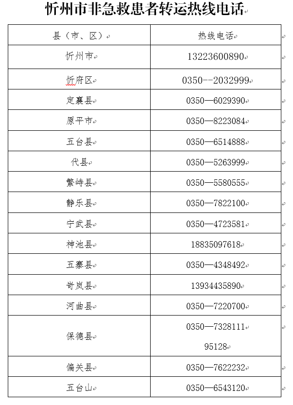 当前疫情防控进入新阶段,工作重心从防控感染转到医疗救治上,“保健康、防重症”成为主要目标,各级医疗机构正面临着更加严峻的挑战和考验。随着新冠病毒感染患者的不断增多,加上冬季寒冷的天气引发基础性疾病的患者骤增。为充分满足患者就诊需求,积极应对救治高峰,保障人民群众非急救转运需求,有效分流非急救患者,忻州市在全市开设非急救转运热线电话,具体情况公布如下: